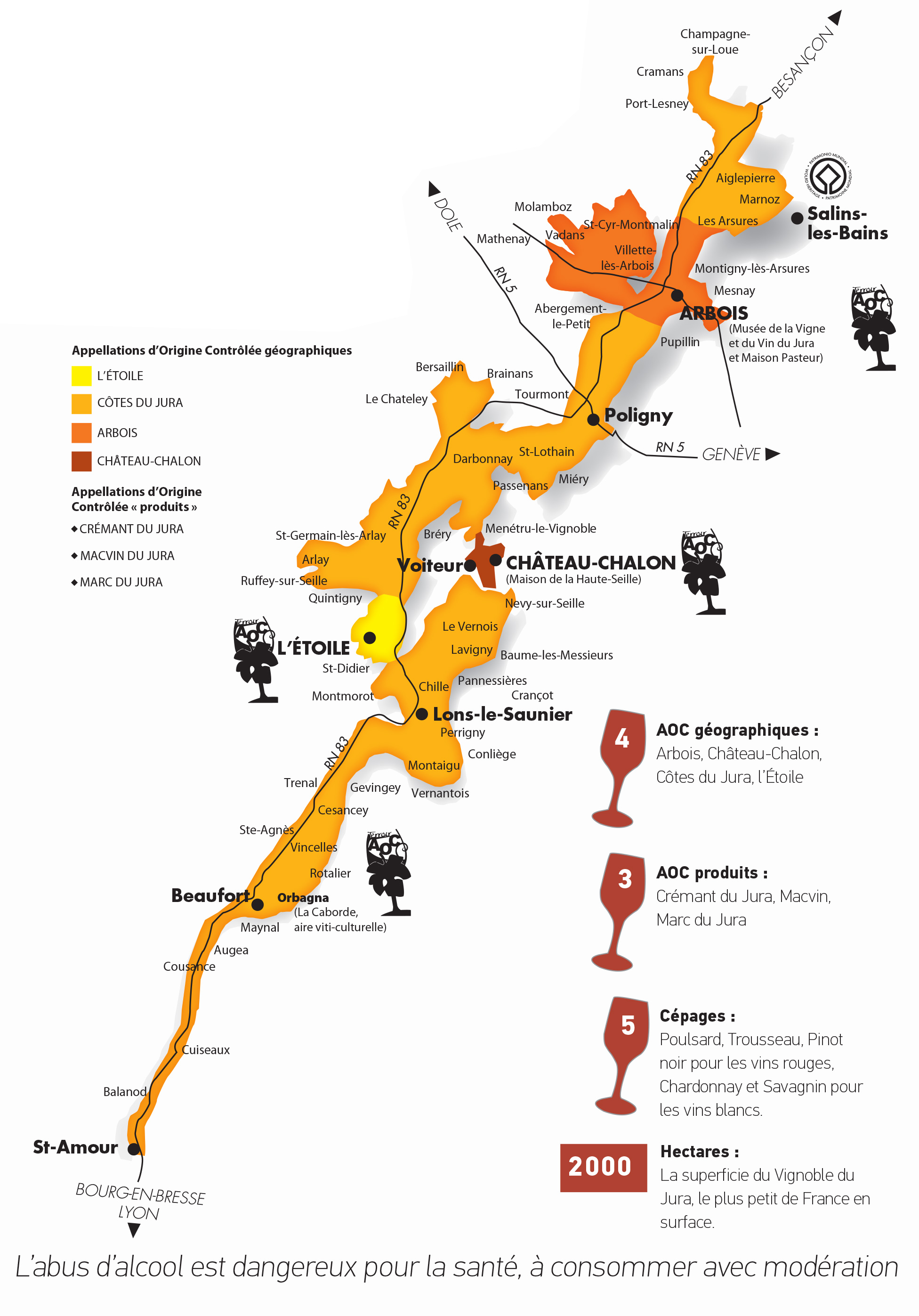 Il existe 6 AOC au sein du vignoble du Jura : 4 appellations géographiques et 2 appellations produits.